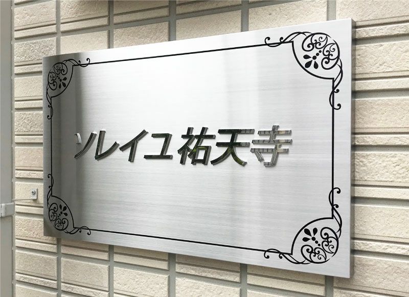 シャープで凛とした表情のステンレス銘板はあらゆる建物とも相性が抜群です。