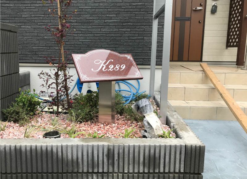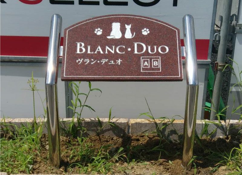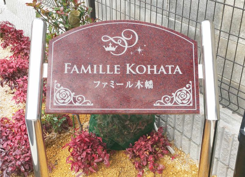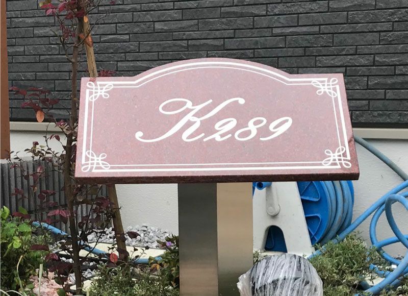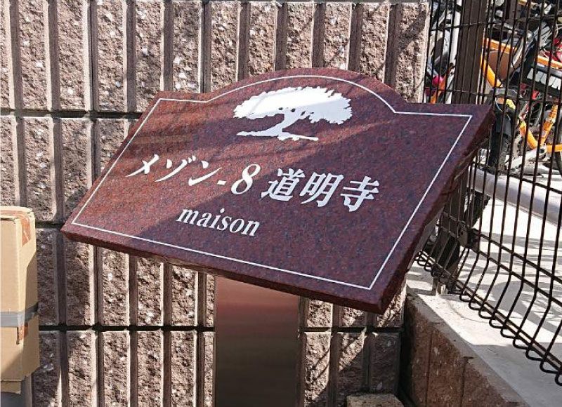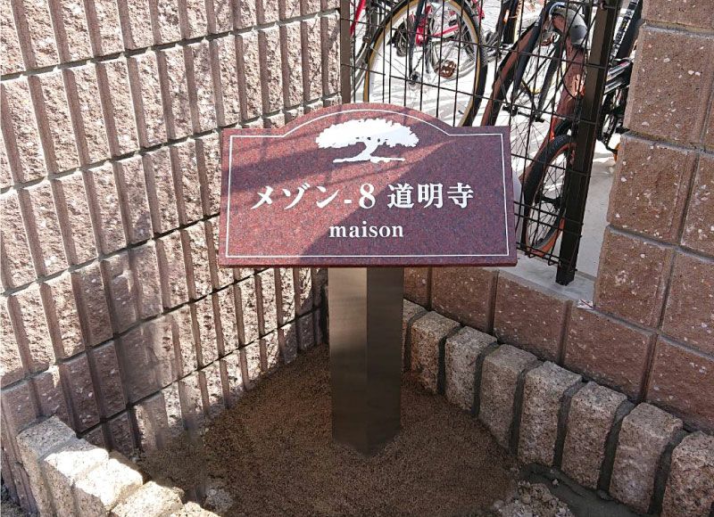 アパート看板 御影石銘板、赤い石でできた看板、文字彫り込み、天然素材の優しさが魅力のマンション看板、会社の銘板としてもおすすめ