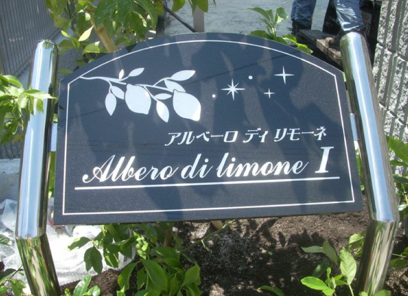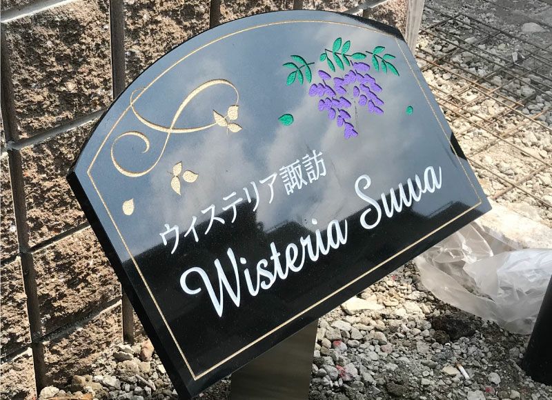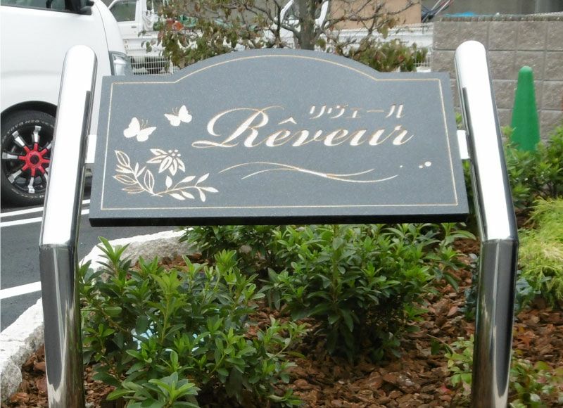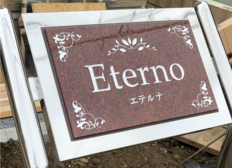 御影石とステンレスフレームの組み合わせで、圧倒的な重厚感と存在感あふれる「フレームウォールサイン」取り付け場所を選ばず、どんな建物にもマッチする館銘板です。