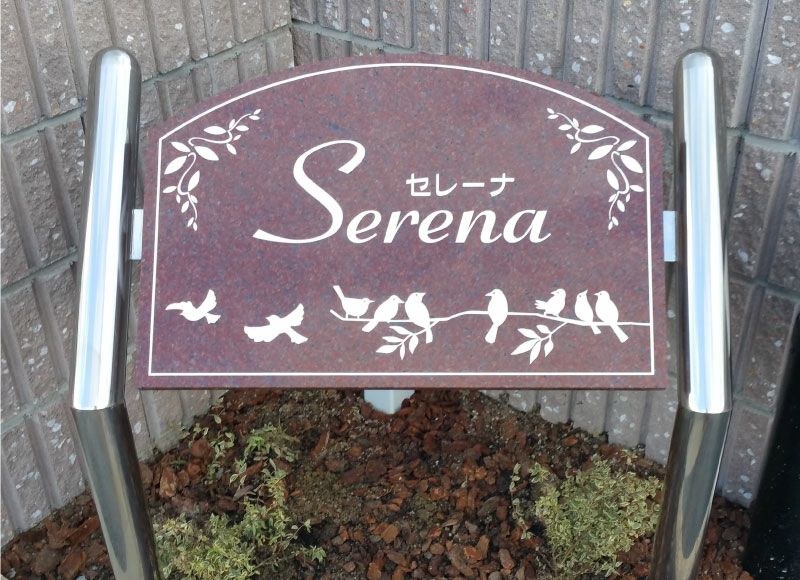 ・赤御影石銘板 天アーチ 1本脚ステンレス支柱 御影石銘板