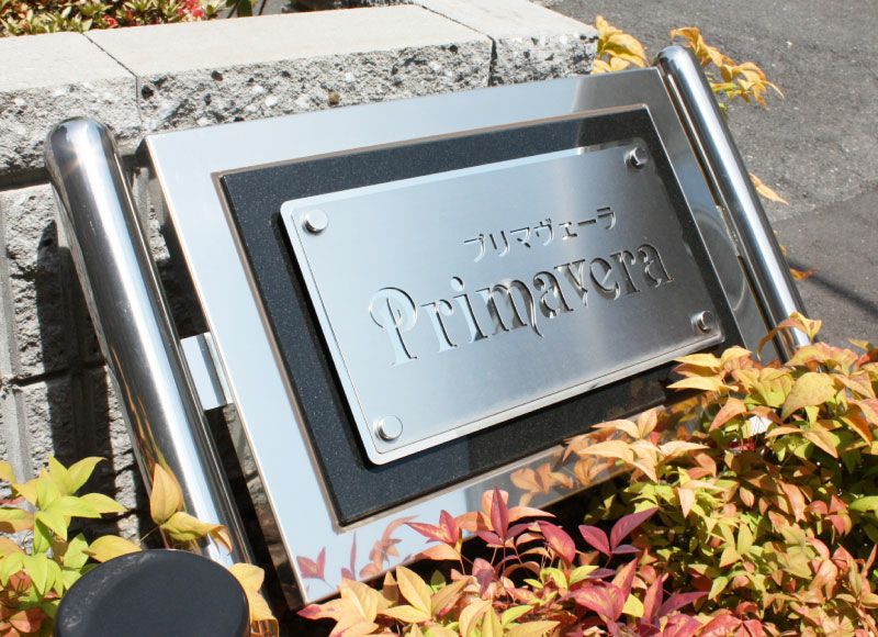 耐久性に優れたステンレス素材のマンション看板、おしゃれなアパートの看板、会社の看板としてもおすすめ
