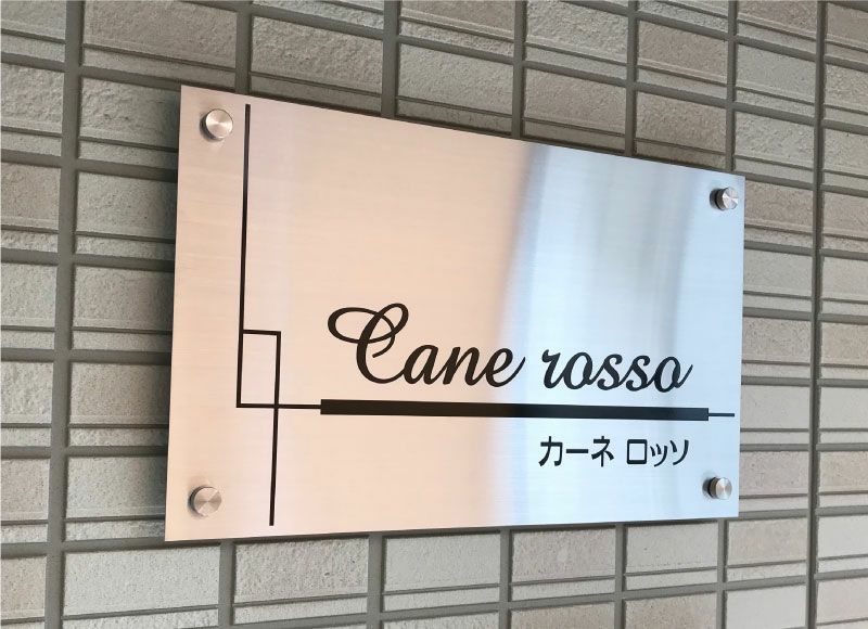 曲線美が優雅で、動きのある表情豊かなオリジナル銘板。耐久性のあるステンレス看板に丸みをもたせ、やわらかな印象に。建物のファサードをあたたかく彩ります。