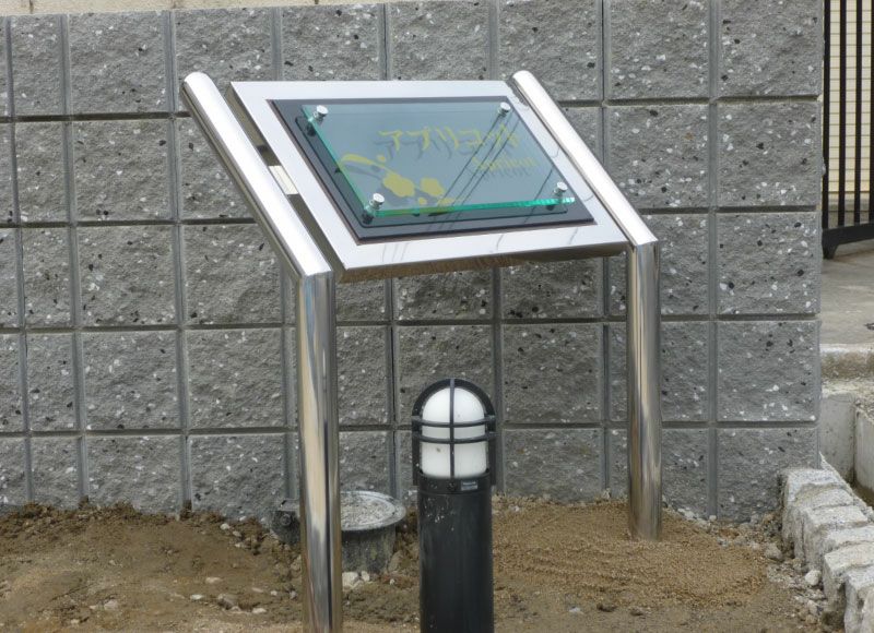 アパート看板 耐久性が良いステンレス素材のマンション看板、会社の銘板としてもおすすめ