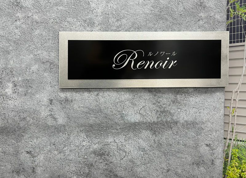 奥行きの限られた空間を演出する木目調のスリムな銘板。