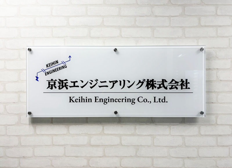 化粧ビスでしっかりと設置させていただきました。透明感の高いアクリル素材で会社の印象をグッと引き上げる