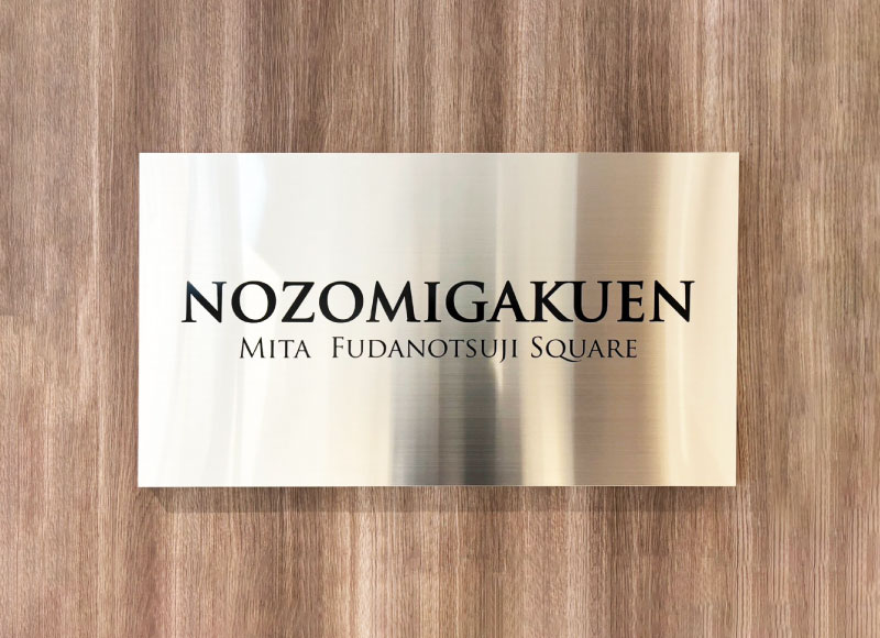 定番でありながら高い機能性と美しさを兼ね備えた「ステンレスヘアーラインの裏蓋式銘板」。裏蓋式は厚みがあり、立体的で重厚な雰囲気を生み出します。