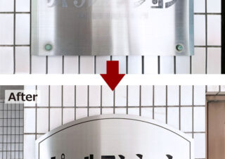 既存文字撤去→新規ステンレス銘板(裏蓋式)